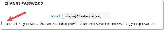 To change your password in the ‘Change Password’ section, click the checkbox that states “If checked, you will receive an email that provides further instructions on resetting your password.” The email associated with your account is shown in the ‘Email’ field above.