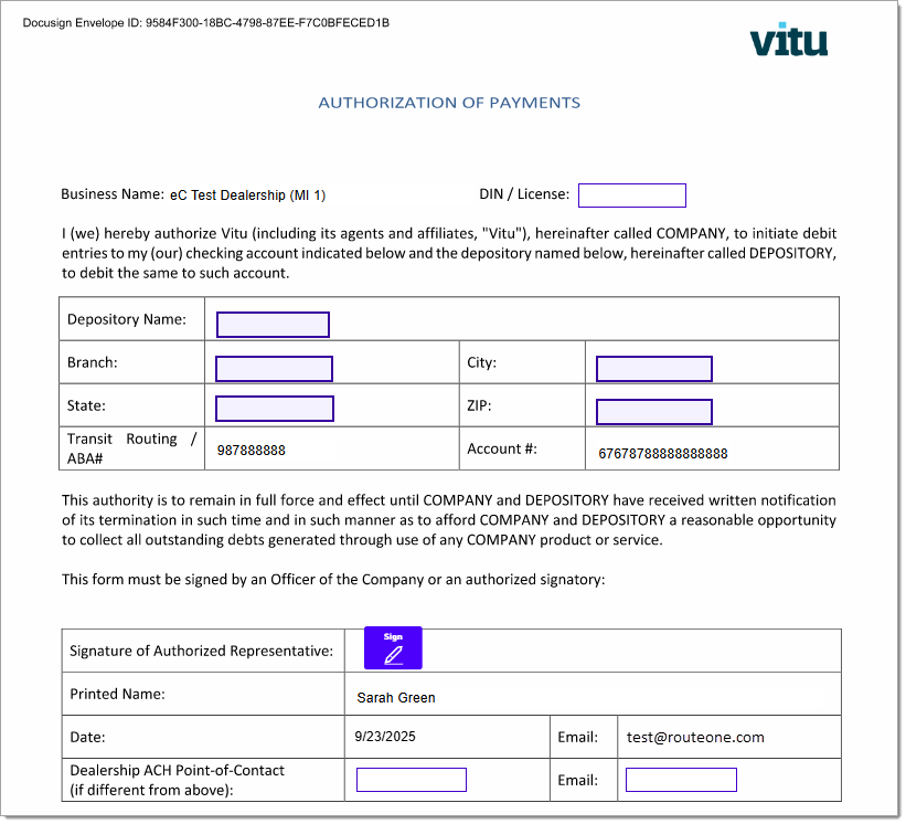 Once the form has been signed by both the Dealer and ACH Authorized Signatory, DocuSign will send an email to RouteOne and the signatories, notifying them that all parties have completed signing.