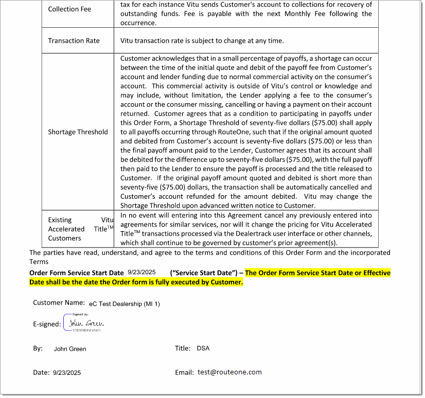 RouteOne will then review the completed Order Form to ensure that that the ACH information provided during subscription matches with the voided check and proceed with activating the service.
