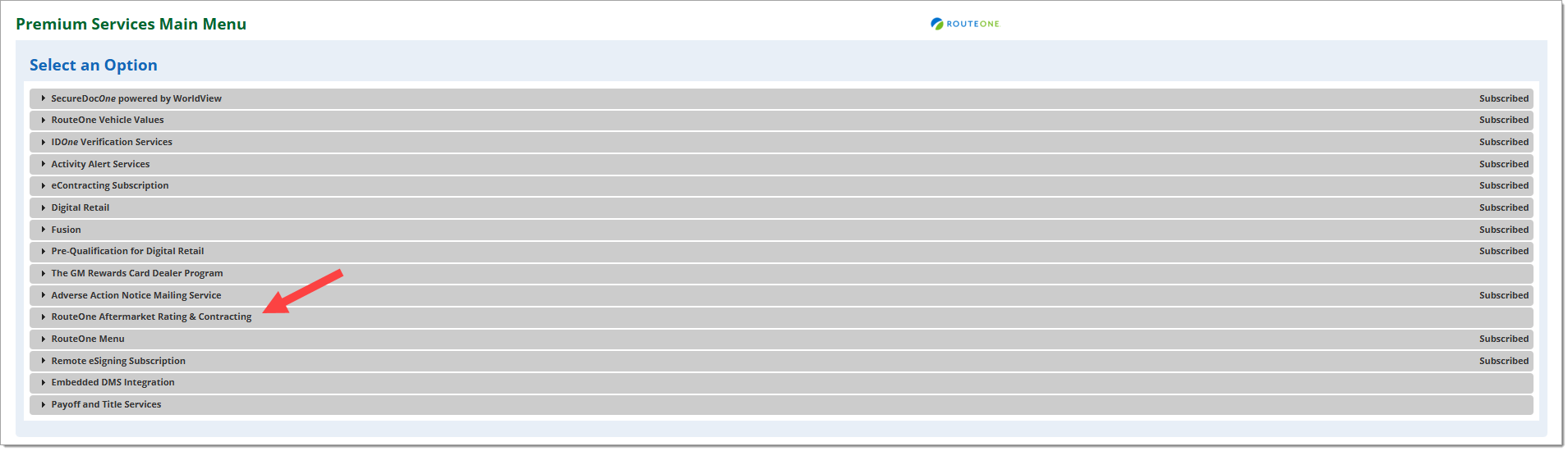 You will be navigated to the ‘Premium Services Main Menu’ page. Click ‘RouteOne Aftermarket Rating & Contracting’ to expand the section.