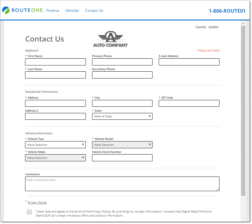 If you want to dynamically choose the language for the URL, you can place a “locale” query-string parameter in your URL as shown in the language-specific URLs. Your country must be either the United States or Canada, and it must match the country of your RouteOne account associated with your Digital Retail subscription. Your language must be one of the supported languages. Digital Retail supports English (en), Spanish (es), and French (fr) for lead capture forms.