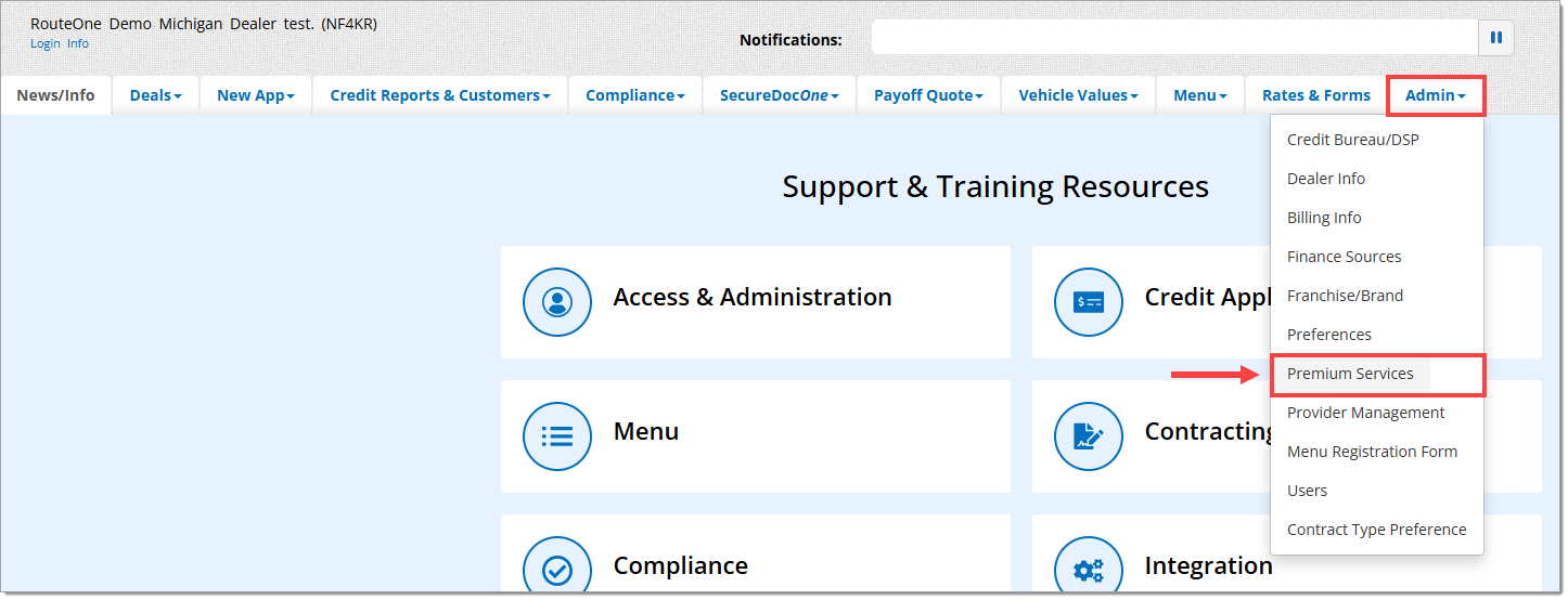 Under ‘Admin’ from the top navigation, select ‘Premium Services.’ If you do not see this option, it may mean that you do not have adequate permissions. You will need to contact your Dealer System Administrator (DSA) for assistance.
