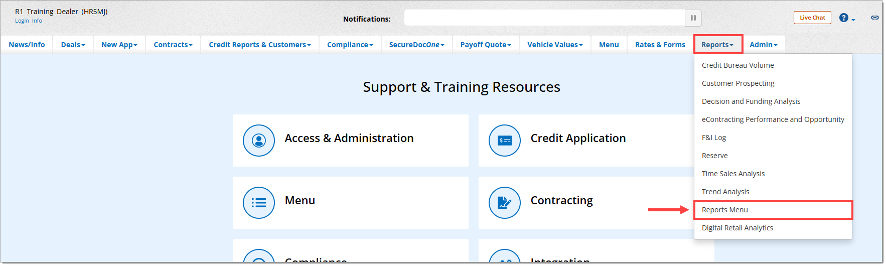 Option 2: Click directly on the ‘Reports’ navigation tab (or select ‘Reports Menu’ from the ‘Reports’ dropdown menu):