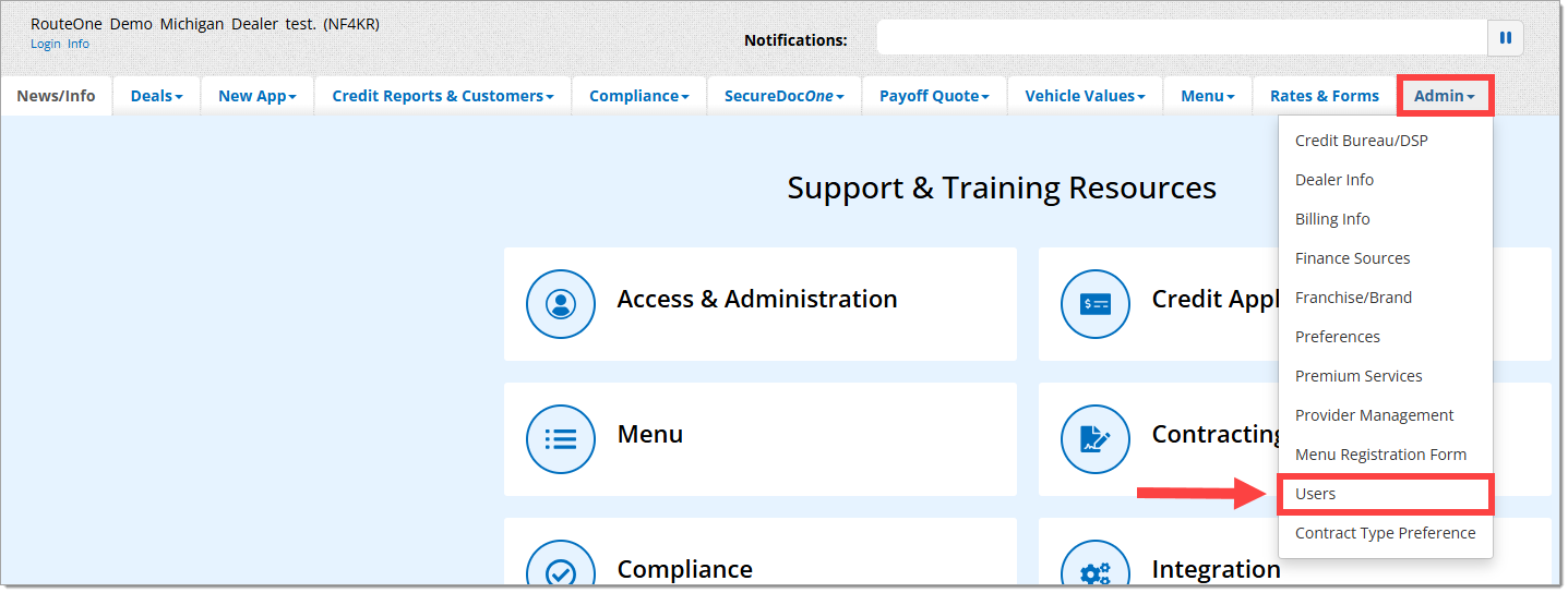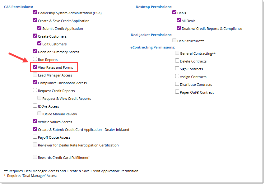 In order to view ‘Rates & Forms’ you must have that permission enabled by your Dealership System Administrator (DSA).  Access is enabled on a user-by-user basis. Your DSA can enable your access at any time by completing the following steps:
