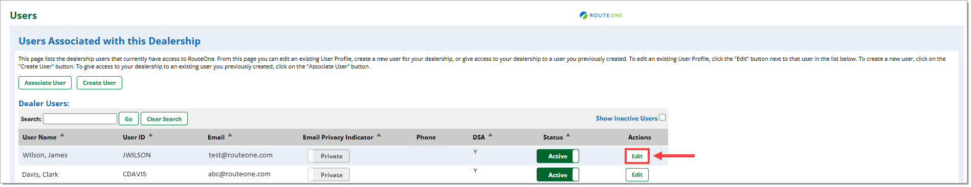 You will be directed to the ‘Users’ page, which lists all of the dealership’s users and their permissions.