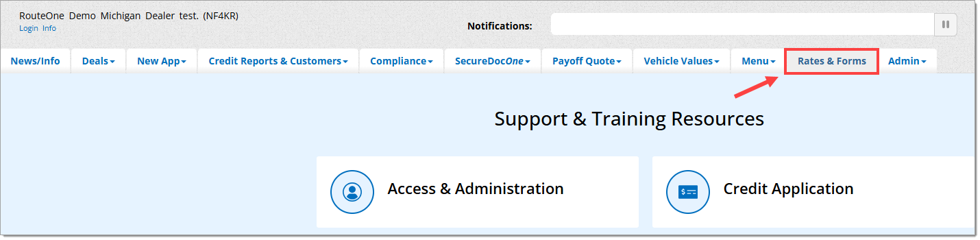 The ‘Rates & Forms’ tab in RouteOne is the first place to look for updated rates or program information from your finance sources. It can eliminate the need to call your finance sources or search through physical rate sheets.