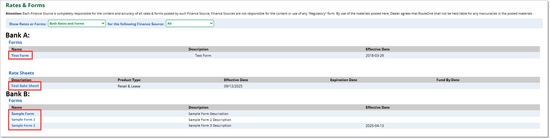 You will be directed to the ‘Rates & Forms’ page, where you will see all of the available rates and forms from each finance source that has uploaded them.