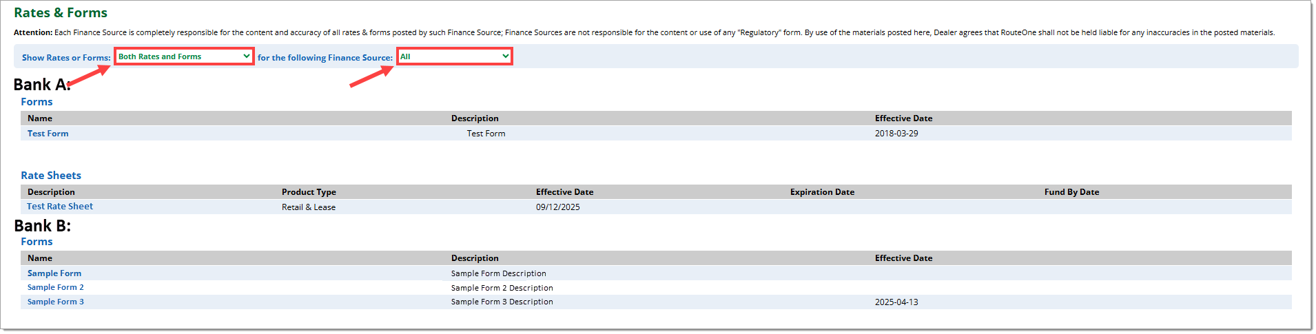 While all available rates and forms are visible when the page loads, you can filter if you would like to view both rates and forms, just rates, or just forms. You can also filter if you would like to see all finance sources, or only a specific finance source.