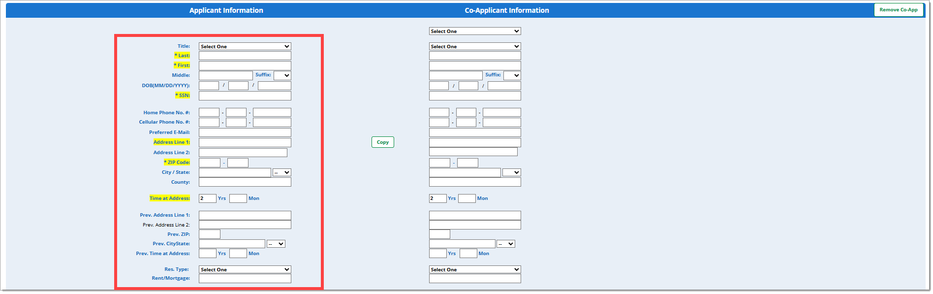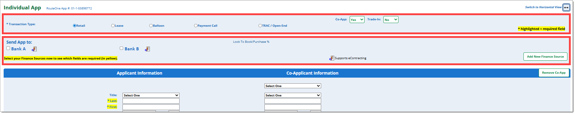 The fields displayed will be the same for all finance sources; however, the required fields for the finance source(s) you selected will be highlighted in yellow. Note that required fields may vary depending on which finance source(s) you select.