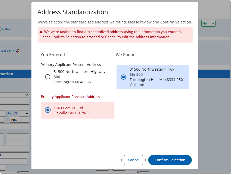 If the system is unable to find a standardized address using the information you entered, an error message will appear. You can click ‘Confirm Selection’ to continue and use the address as-is or click ‘Cancel’ to return to the application and edit the address.