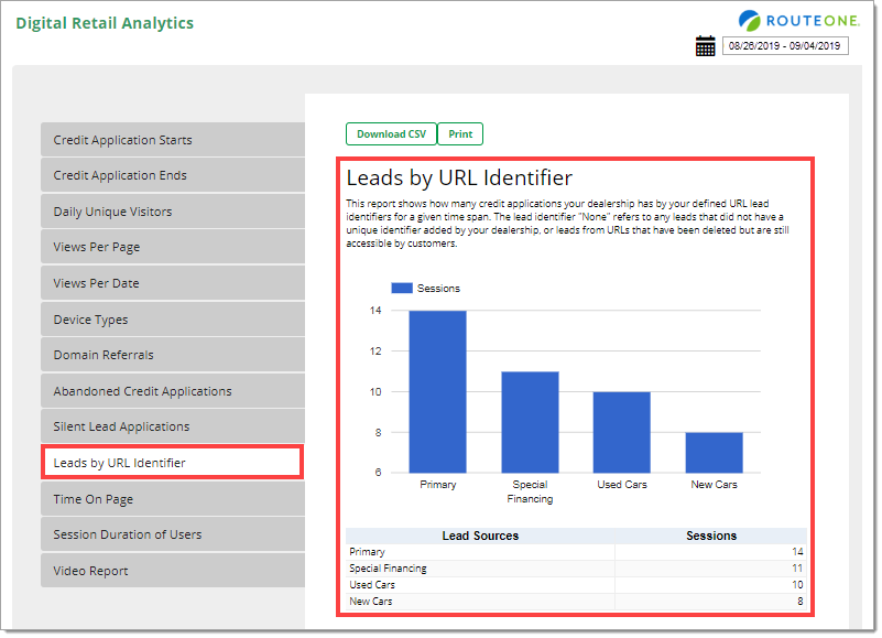 Collected data and analytics for your lead identifiers will be viewable in Digital Retail analytics, under the ‘Leads by URL Identifier’ report.