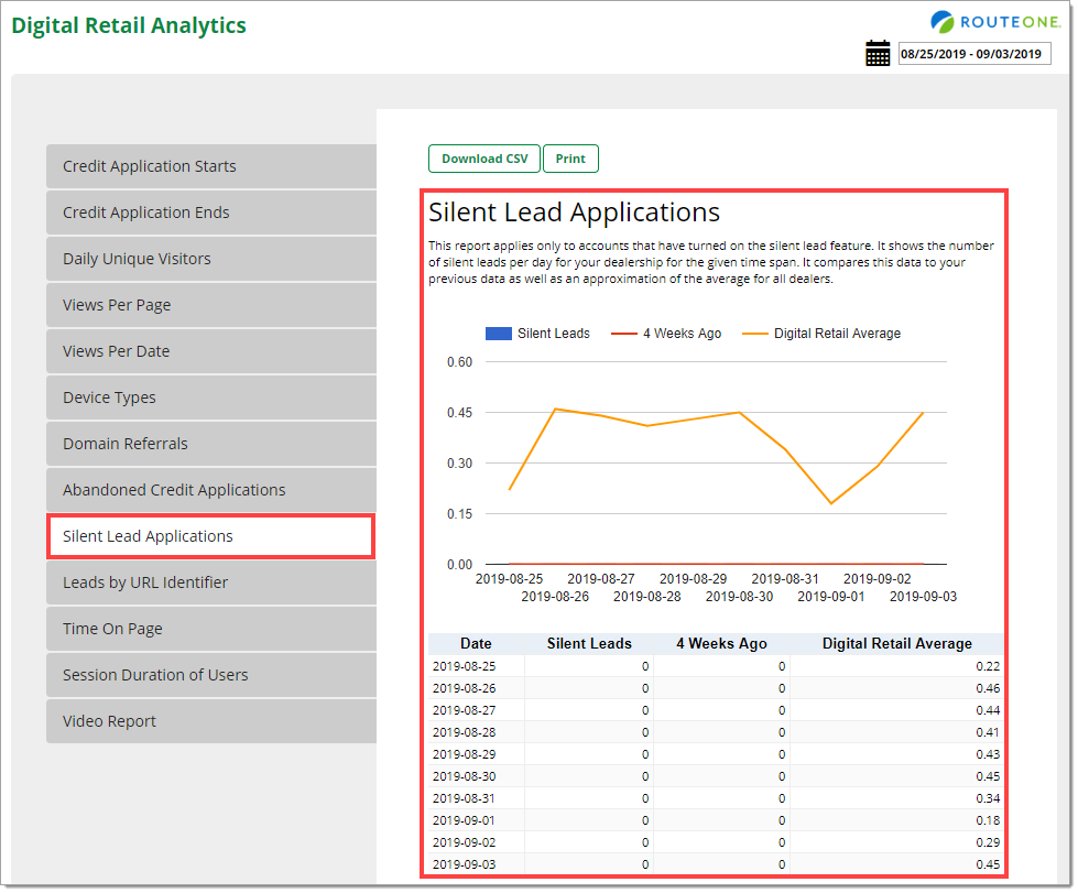 When silent leads are turned on, collected data and analytics will be viewable in Digital Retail Analytics, under the ‘Silent Lead Applications’ report.
