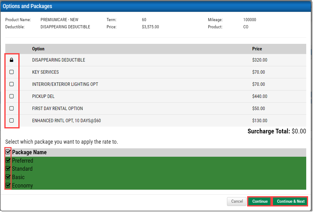 Select any relevant options as well as what packages to add the product to using the checkboxes.  Then, click ‘Continue’ if you would like to remain on the same page, or ‘Continue and Next’ to move on to the next tab in the ‘Rate Products’ screen.