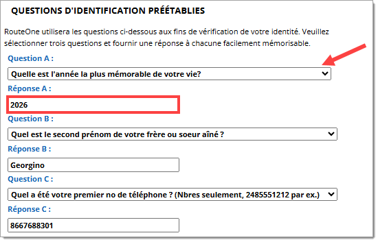 Dans la section « Questions d’identification préétablies », vous pouvez mettre à jour les trois questions utilisées par RouteOne pour confirmer votre identité. Ces questions et réponses ont été définies lors de votre première connexion à votre compte RouteOne.