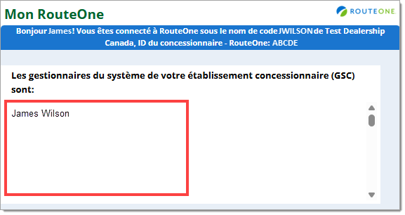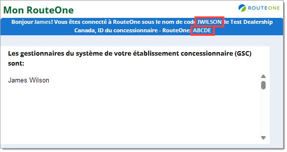 « Bonjour James! Vous êtes connecté à RouteOne avec l’identifiant d’utilisateur JWILSON du concessionnaire Test Dealership Canada, Identifiant du concessionnaire RouteOne : ABCDE »