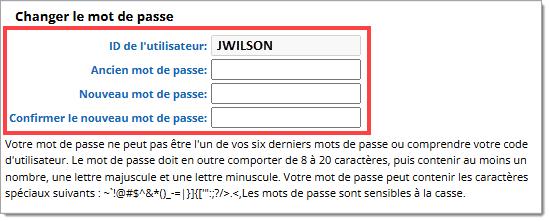 Vous pouvez modifier votre mot de passe en inscrivant votre ancien mot de passe, votre nouveau mot de passe, et en confirmant ce dernier.