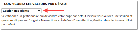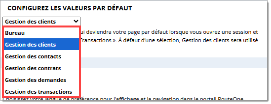Pour sélectionner votre page par défaut, cliquez sur le menu déroulant et choisissez l’une des options.