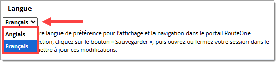 Pour que la langue sélectionnée soit prise en compte, faites défiler la page jusqu’en bas, puis cliquez sur « Sauvegarder ». Ensuite, actualisez votre navigateur ou déconnectez-vous puis ouvrez une nouvelle session RouteOne.