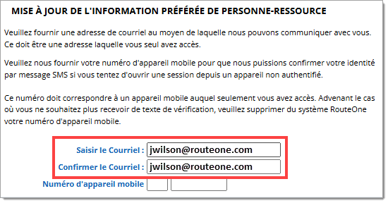 RouteOne utilise ces renseignements pour confirmer votre identité si vous oubliez votre mot de passe et pour l’authentification multifactorielle lorsque vous vous connectez à partir d’un nouvel appareil. Pour en savoir plus sur l’authentification multifactorielle, consultez le guide d’utilisateur Connexion à RouteOne.