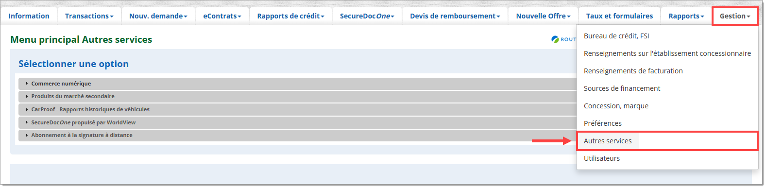 Cliquez sur « Gestion » dans la barre de navigation supérieure et sélectionnez « Autres services ». Si cette option ne s’affiche pas, cela signifie que vous n’avez pas les autorisations nécessaires. Vous devrez communiquer avec votre gestionnaire du système du concessionnaire (GSC) pour obtenir de l’aide.