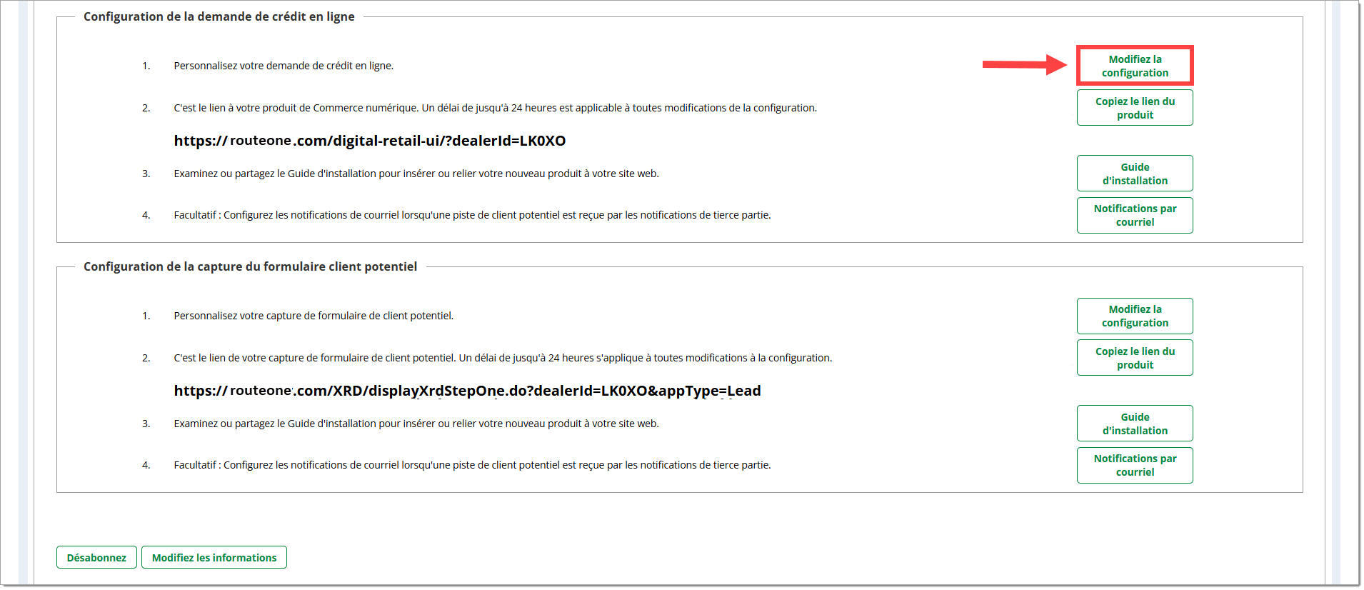 Vous pouvez accéder à ce paramètre en cliquant sur « Modifiez la configuration » dans la section « Configuration de la demande de crédit en ligne », en accédant à l’onglet « Paramètres de base » et en cliquant ensuite sur la section « Gestion des clients potentiels ».