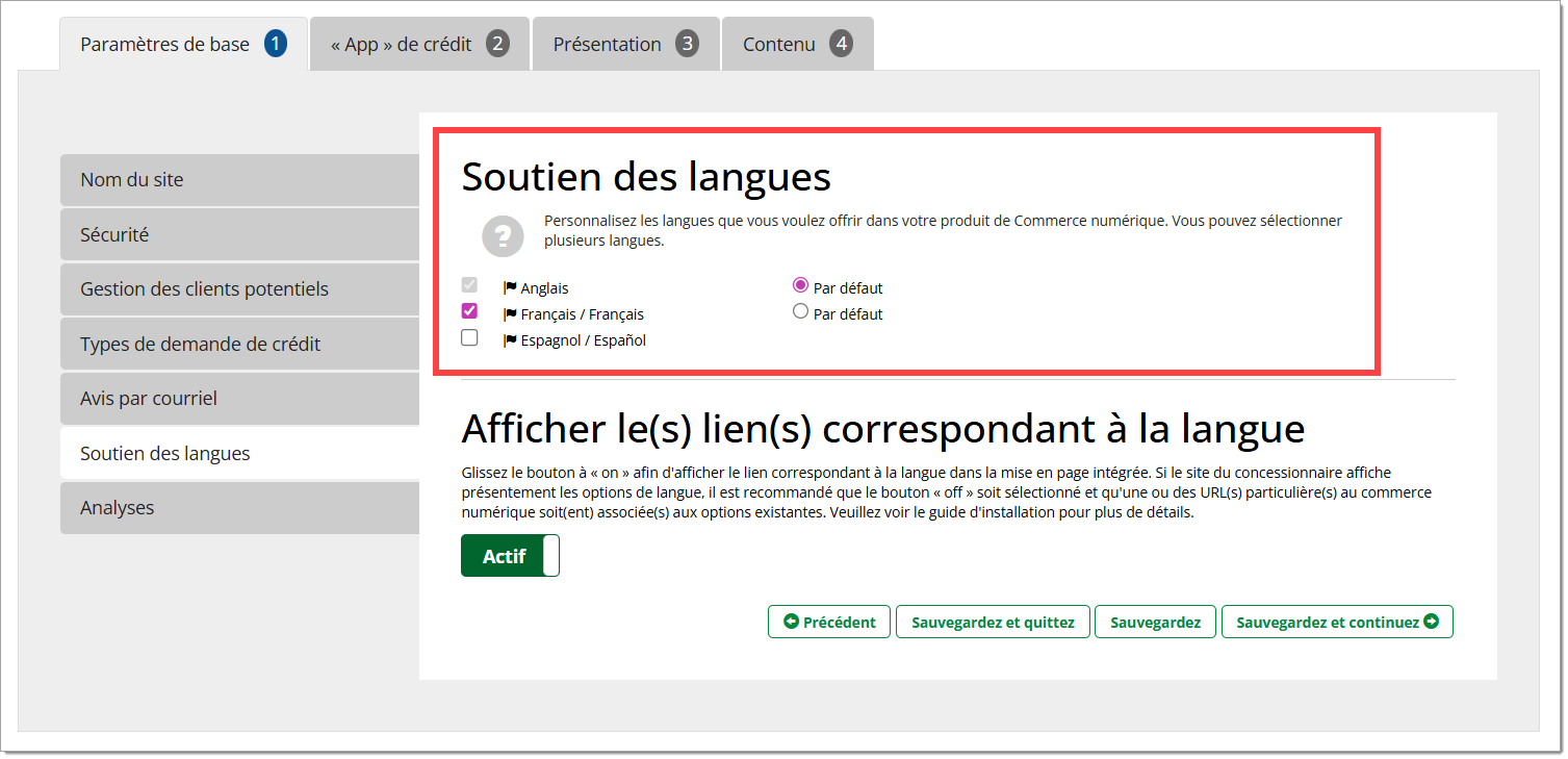 À l’onglet « Paramètres de base », accédez à l’onglet « Soutien des langues ». Vous pouvez ensuite personnaliser les langues prises en charge par votre demande de crédit en ligne.