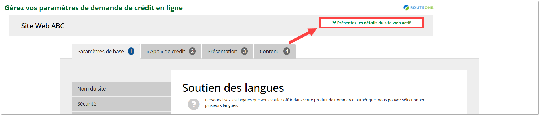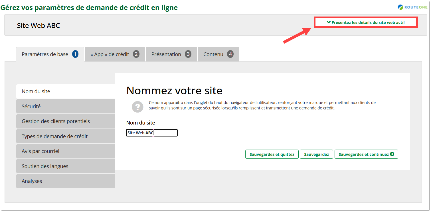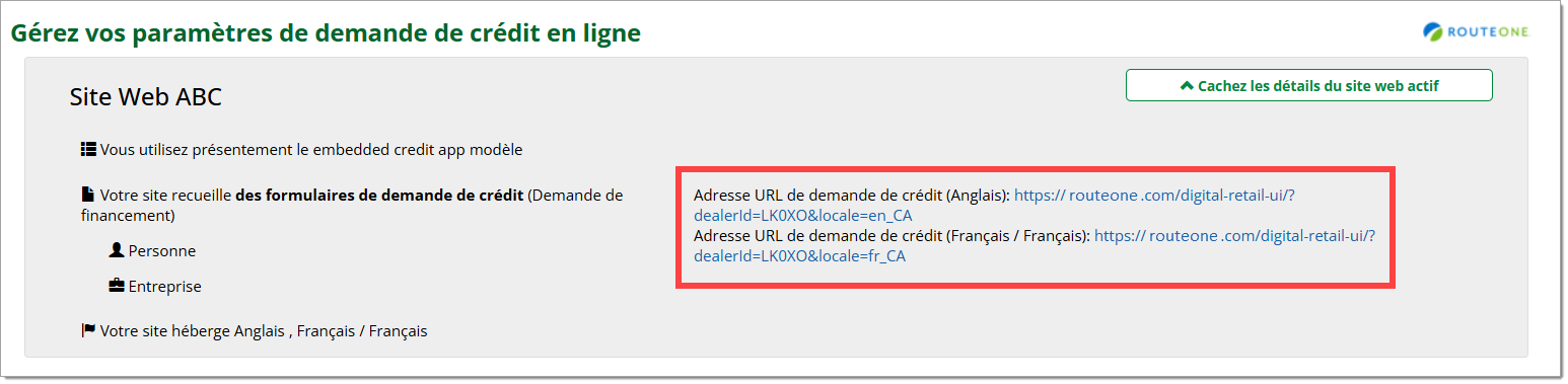 Pour trouver les URL propres à chaque langue, accédez à votre configuration de demande de crédit en ligne et cliquez sur le bouton « Présentez les détails du site web actif » près du haut de la page pour développer la section.