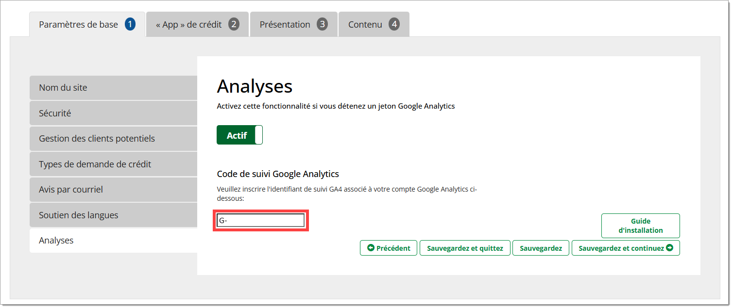 3. Le gestionnaire du système du concessionnaire doit vérifier, à l’onglet « Analytics » (Analyses), que l’identifiant de mesure GA4 adéquat a été indiqué et que la fonctionnalité Google Analytics est activée.