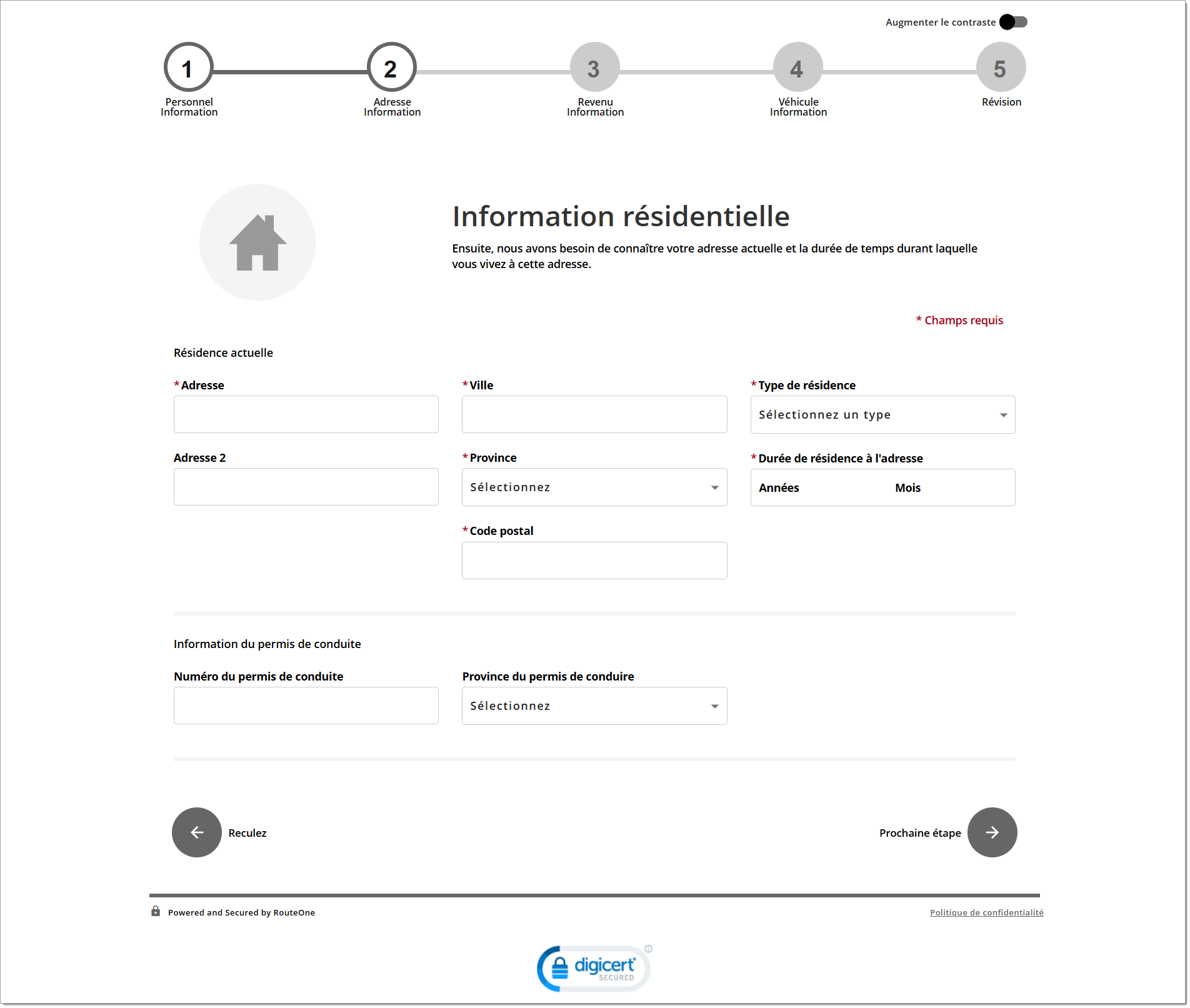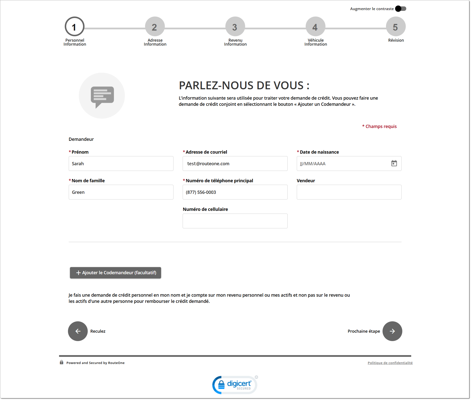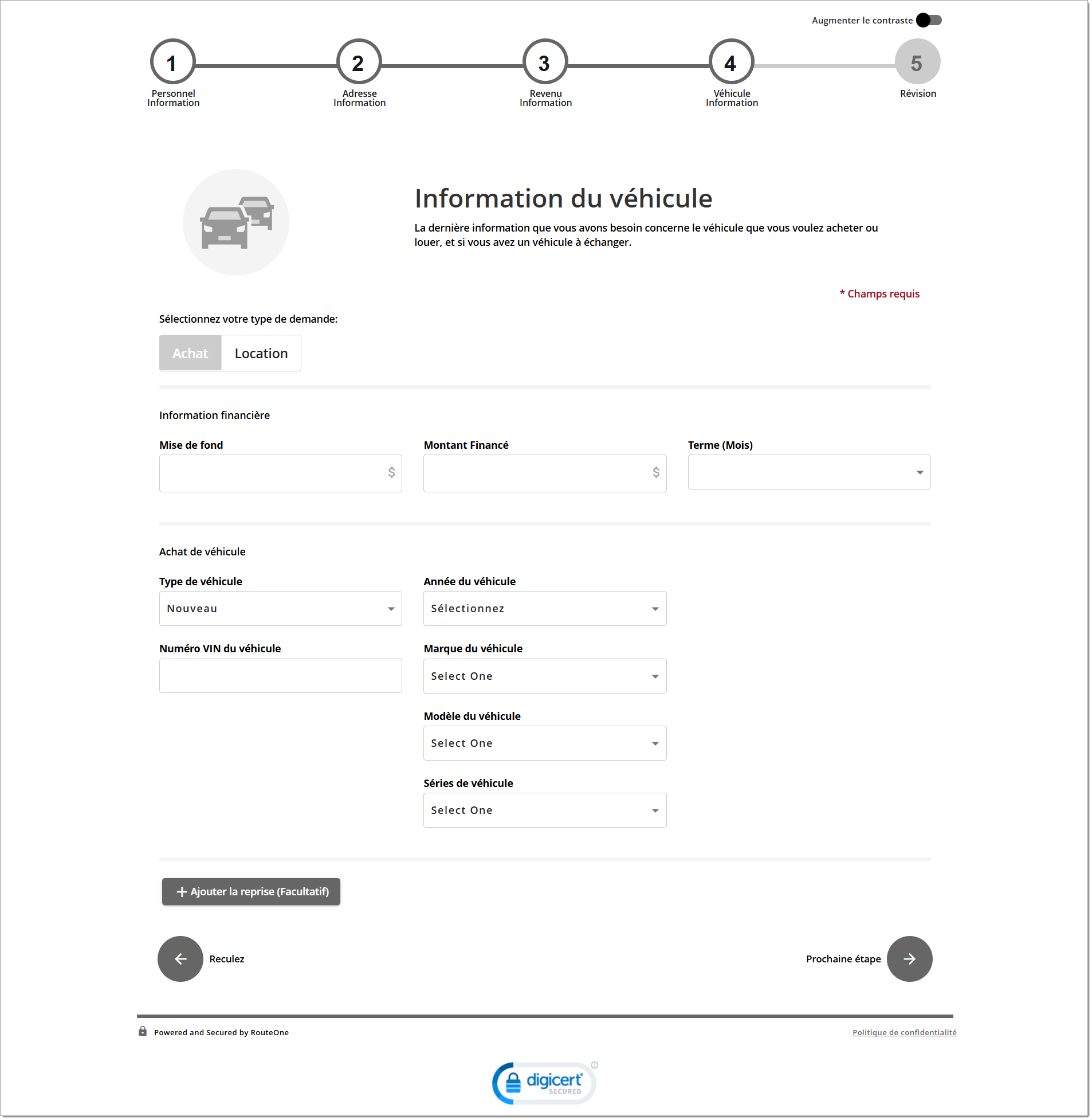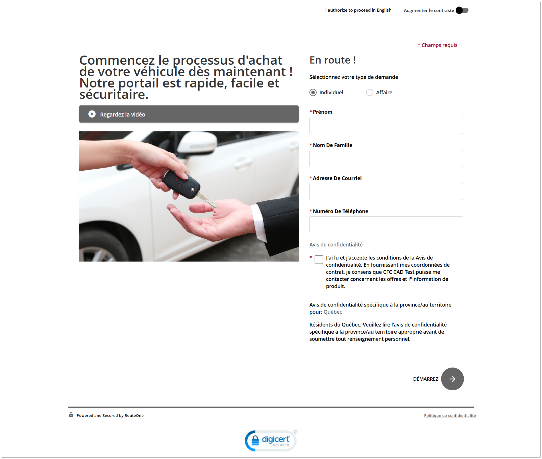 À titre de comparaison, le formulaire d’identification des clients potentiels est offert par l’entremise des services de vente au détail numériques de RouteOne et n’exige que quelques coordonnées (nom, adresse de courriel, numéro de téléphone) pour permettre au consommateur de soumettre ses renseignements.