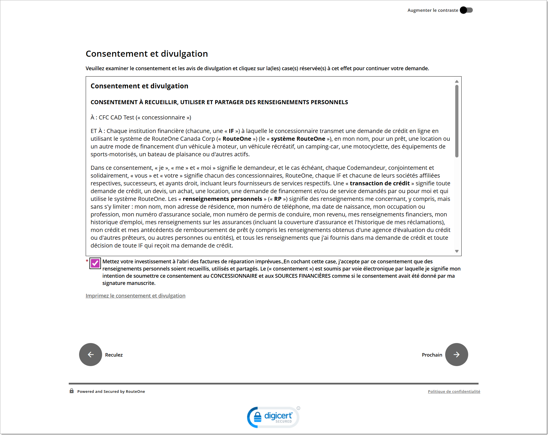 Page de consentement et de divulgation