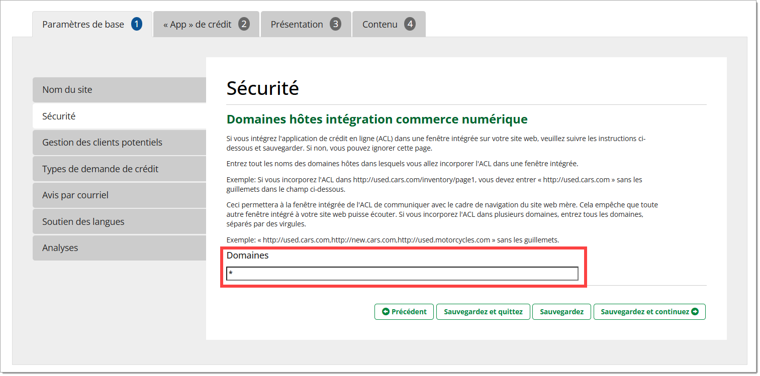 Pour vous assurer que la communication interdomaines utilisée par la demande de crédit direct au consommateur est limitée au cadre de votre site Web, utilisez l’assistant de configuration des services de vente au détail numériques dans l’application du système de gestion des demandes de crédit de RouteOne pour indiquer les noms d’hôte complets de tous les sites auxquels vous intégrez la demande de crédit direct au consommateur. Si votre demande de crédit direct au consommateur est intégrée à plusieurs sites, répertoriez-les tous et mettez une virgule après chaque nom d’hôte.