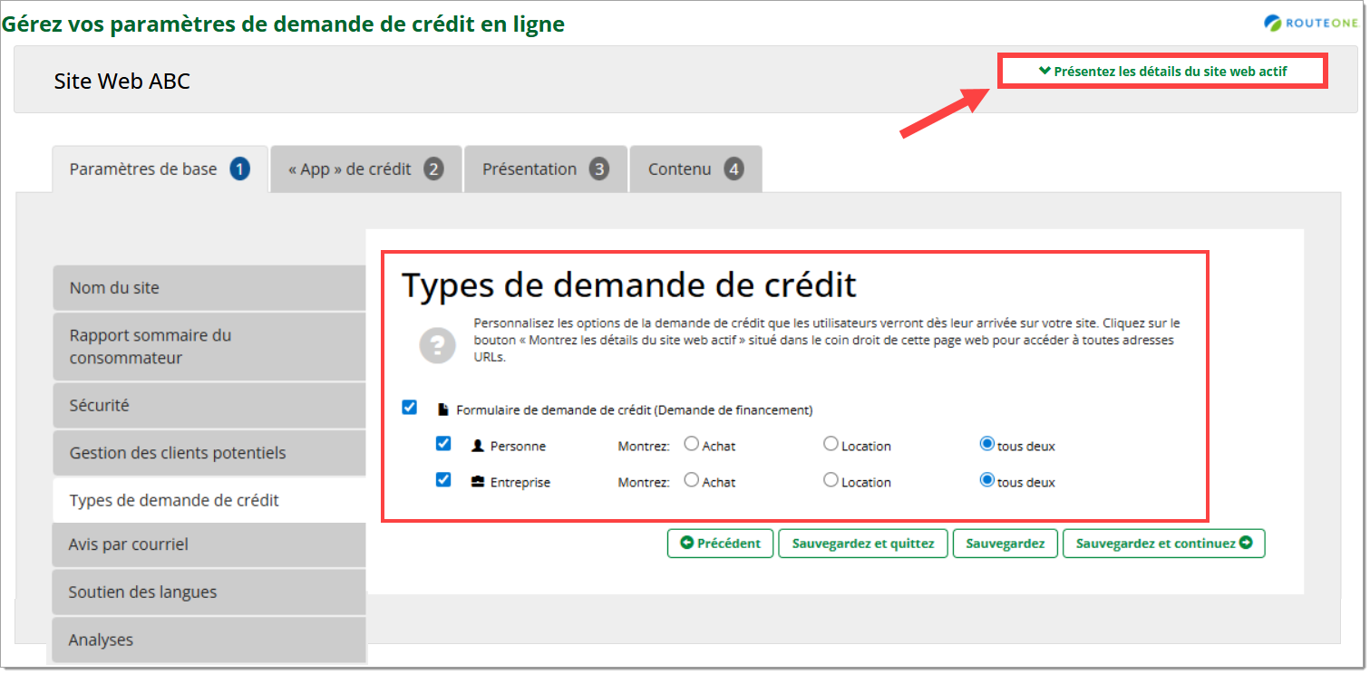 Vous pouvez personnaliser les types de demandes de crédit que les utilisateurs verront (par exemple, personne, entreprise, tous deux) lorsqu’ils cliqueront sur votre lien. En cliquant sur « Présentez les détails du site web actif » dans le coin supérieur droit de la page, vous afficherez toutes les URL de produits principales auxquelles vous êtes abonné (il peut y avoir des URL en français).