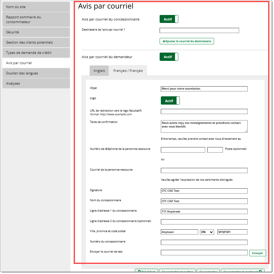 Vous pouvez activer ou désactiver les avis par courriel destinés aux concessionnaires et aux demandeurs, et personnaliser les informations incluses dans ces avis. Cette personnalisation peut être effectuée en anglais et en français.