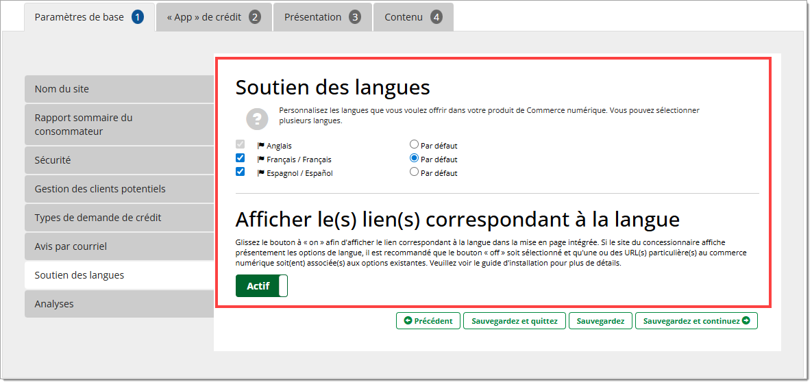 Vous pouvez sélectionner les langues dans lesquelles le client peut consulter la demande de crédit direct au consommateur, ainsi que sélectionner la langue par défaut.