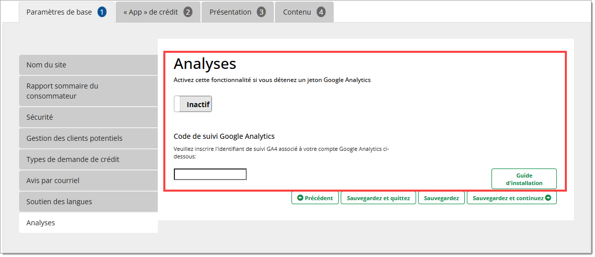 Utilisez le bouton à bascule dans cette section pour activer ou désactiver Google Analytics. Pour plus d’informations, veuillez consulter le Guide des données et des analyses.