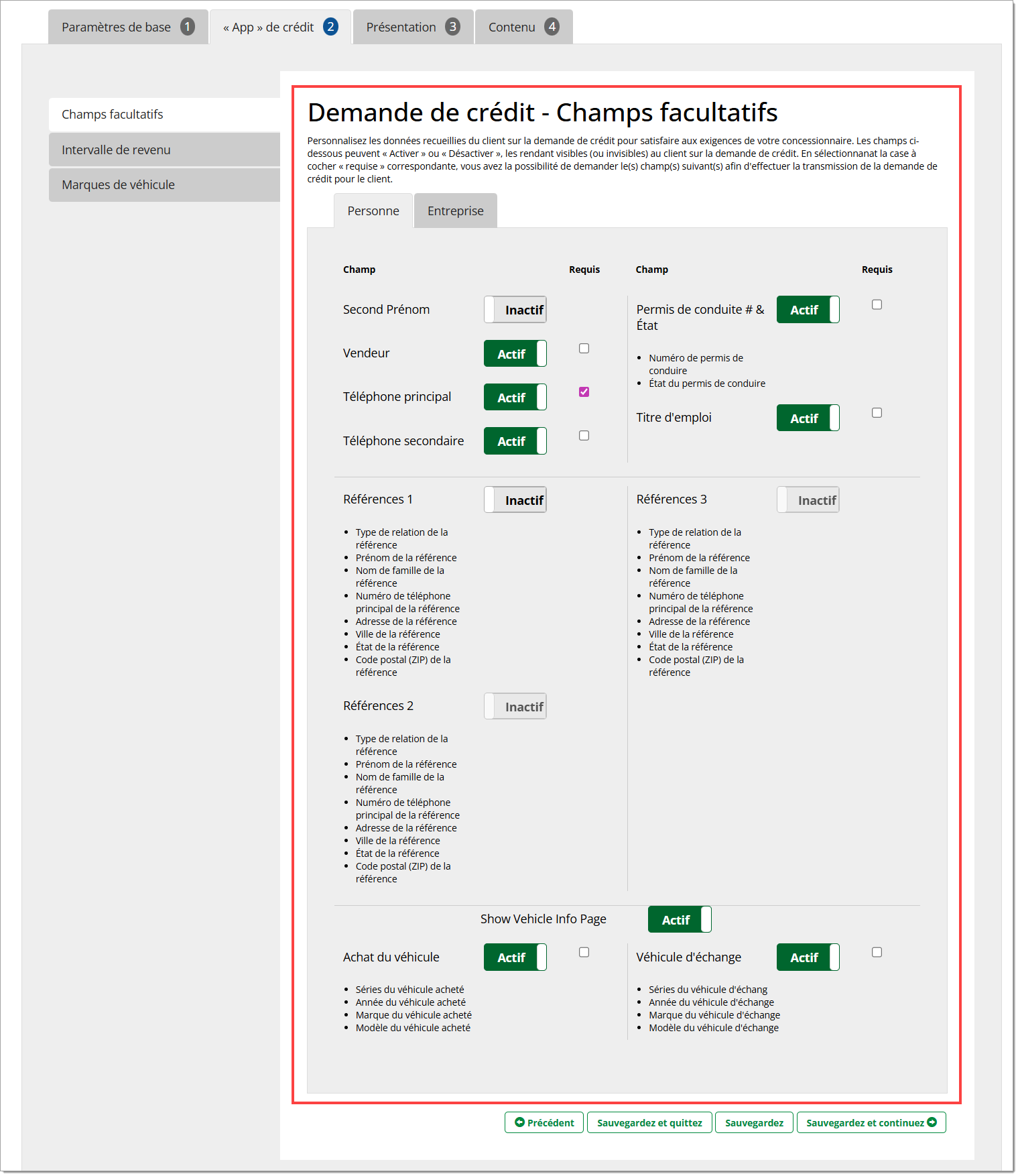 Vous pouvez personnaliser les données recueillies du demandeur sur la demande de crédit pour satisfaire aux exigences de votre concessionnaire en activant ou désactivant les champs.
