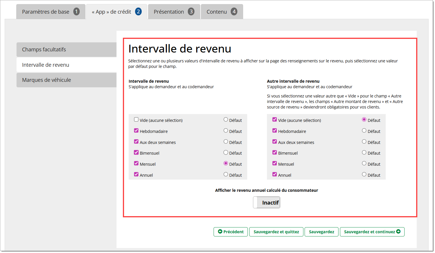 Vous pouvez personnaliser les intervalles de revenus pouvant être sélectionnés dans la demande de crédit direct au consommateur pour les champs « Intervalle de revenu » et « Autre intervalle de revenu ». Sélectionnez les options par défaut.