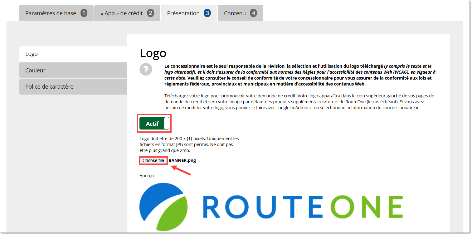 Vous pouvez téléverser votre logo sur votre demande de crédit. Il figurera dans le coin supérieur gauche des pages de votre demande de crédit et sera votre image par défaut pour tous les produits RouteOne actuels ou futurs, le cas échéant. Vous pouvez activer ou désactiver votre logo téléversé selon vos besoins.