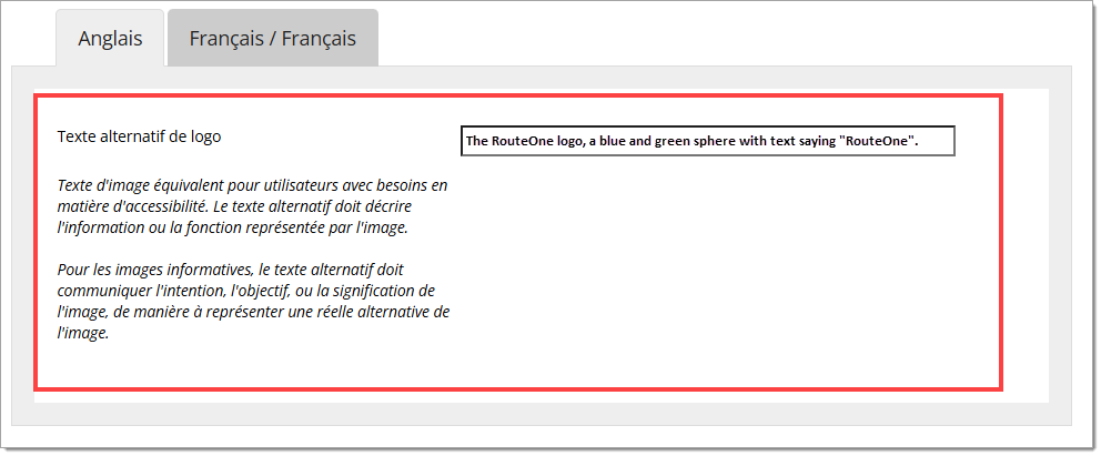 Lorsque vous ajoutez votre logo, vous pourrez également ajouter un texte alternatif, qui permettra aux utilisateurs ayant des besoins en matière d’accessibilité d’utiliser un équivalent textuel de l’image. Le texte alternatif doit décrire l’information ou la fonction représentée par l’image. Les options en anglais et en français sont disponibles pour la configuration.