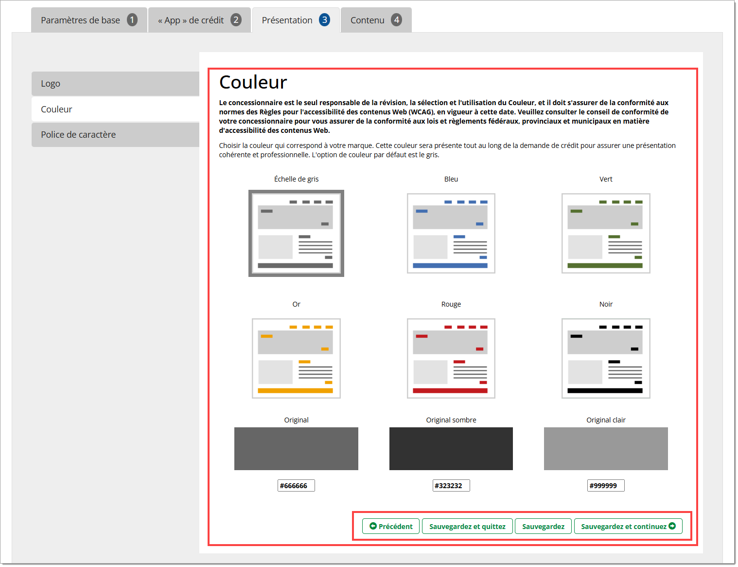 La couleur que vous sélectionnez sera appliquée à l’ensemble de la demande de crédit afin d’assurer une présentation uniforme et professionnelle. L’option de couleur par défaut est le gris.