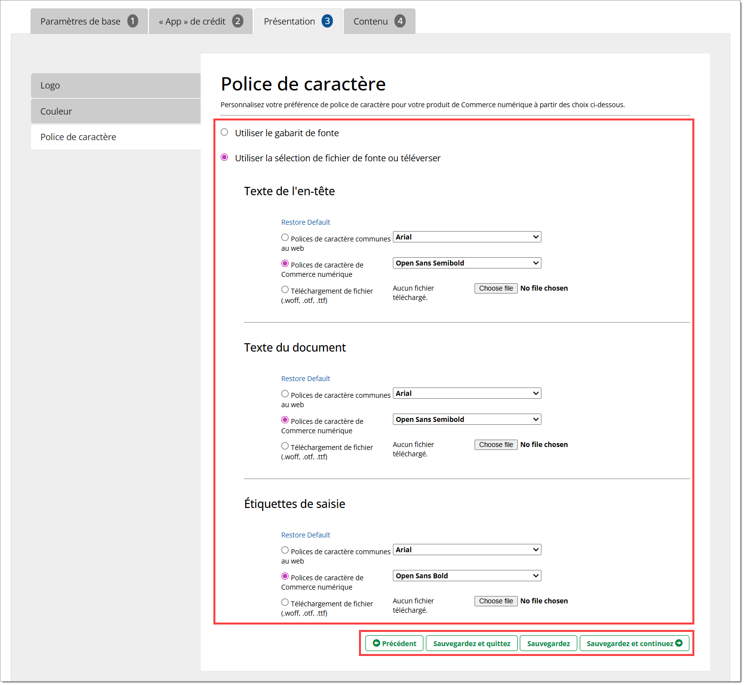 Cliquez sur l’une des options de sauvegarde pour enregistrer votre choix de police. Ces modifications s’appliqueront à l’ensemble du contenu de votre demande de crédit direct au consommateur.