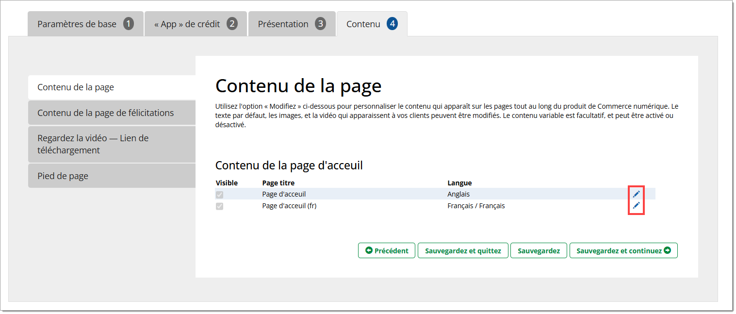 Des personnalisations peuvent être effectuées ici pour les pages en anglais et en français.