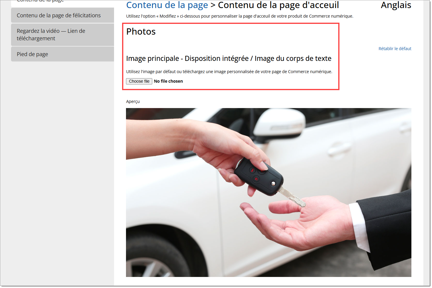 Dans la section « Photos », vous pouvez remplacer l’image par défaut de la page d’accueil en téléversant la vôtre.