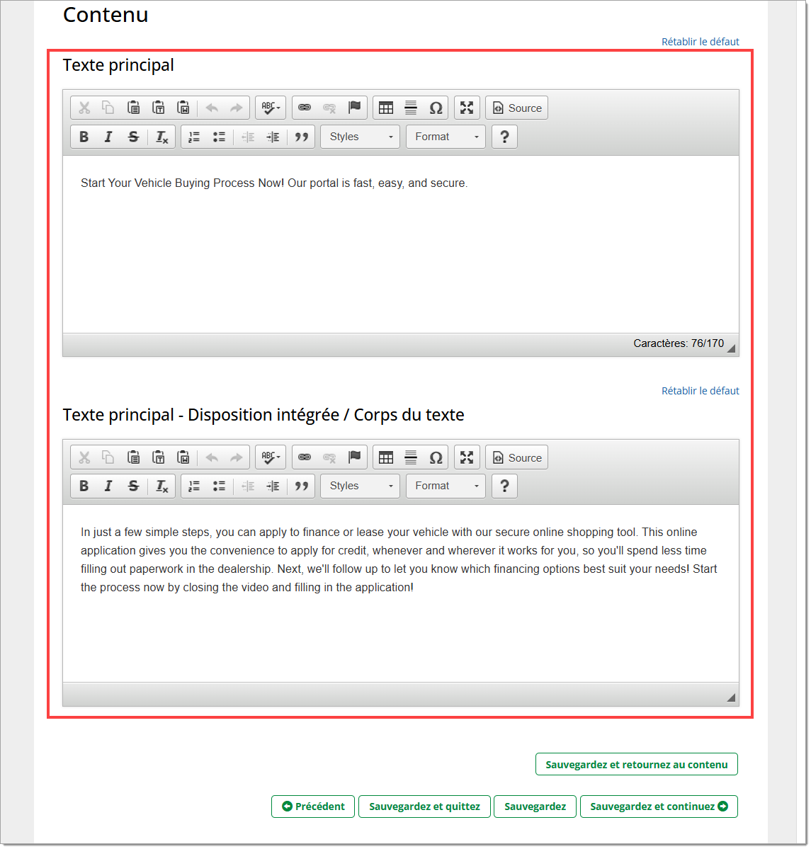 Le texte que vous saisissez dans la section « Contenu modifiable de la page » est celui qui s’affichera pour le demandeur.