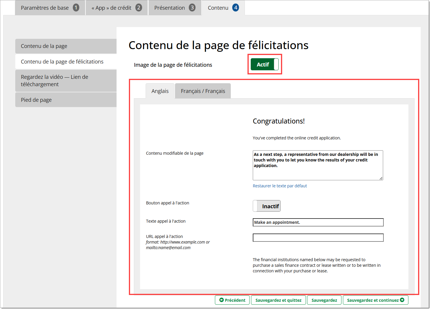 Vous pouvez personnaliser le contenu qui s’affiche pour le demandeur une fois qu’il a terminé le processus de demande de crédit direct au consommateur.