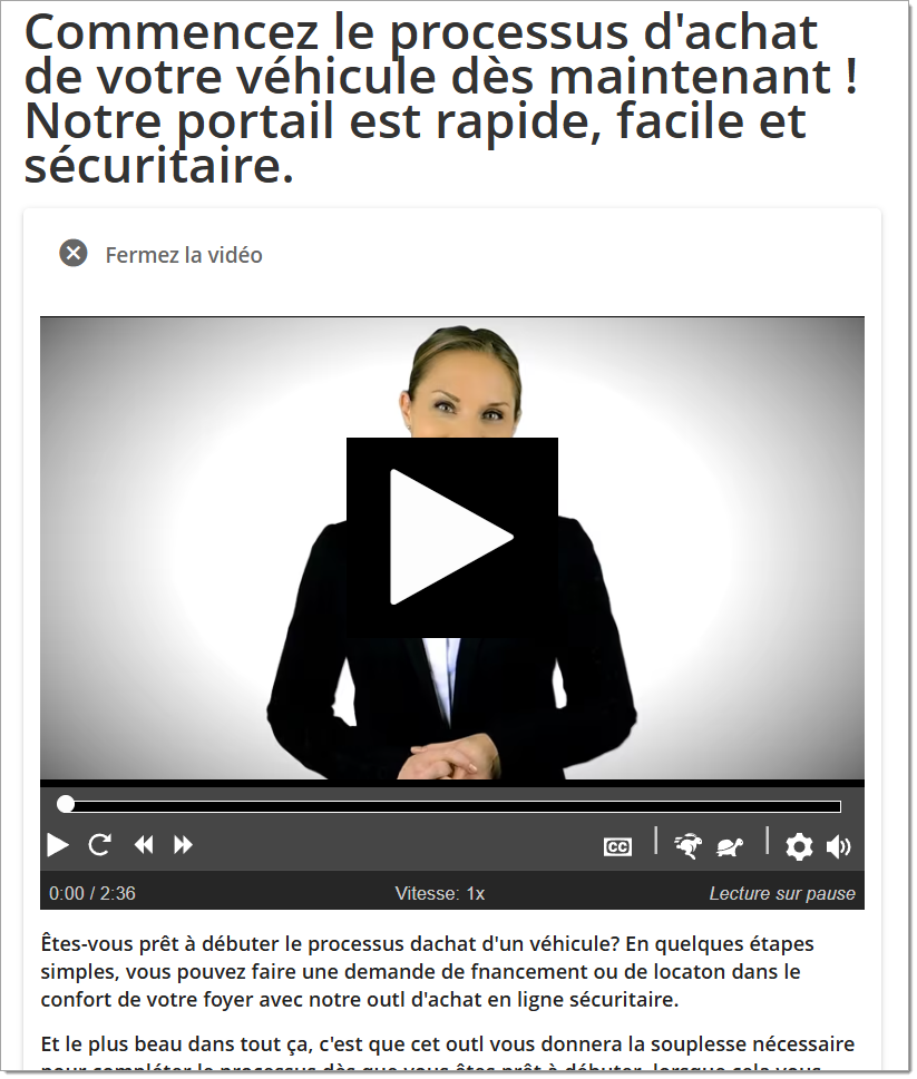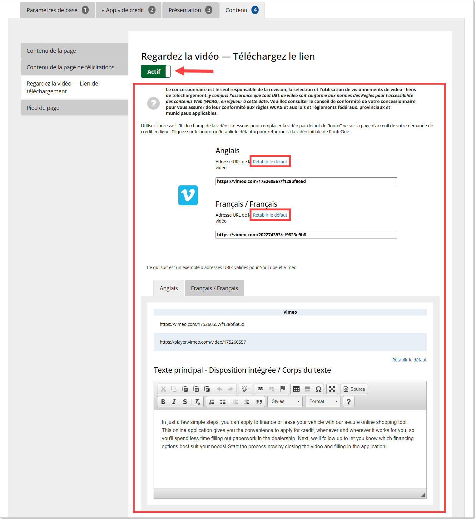 Vous avez également la possibilité de remplacer la vidéo par défaut par votre propre lien vidéo. Veuillez consulter votre conseiller juridique concernant le contenu, la conformité et d’autres considérations qui vous concernent. Cliquez sur « Rétablir le défaut » pour afficher à nouveau la vidéo fournie par RouteOne.