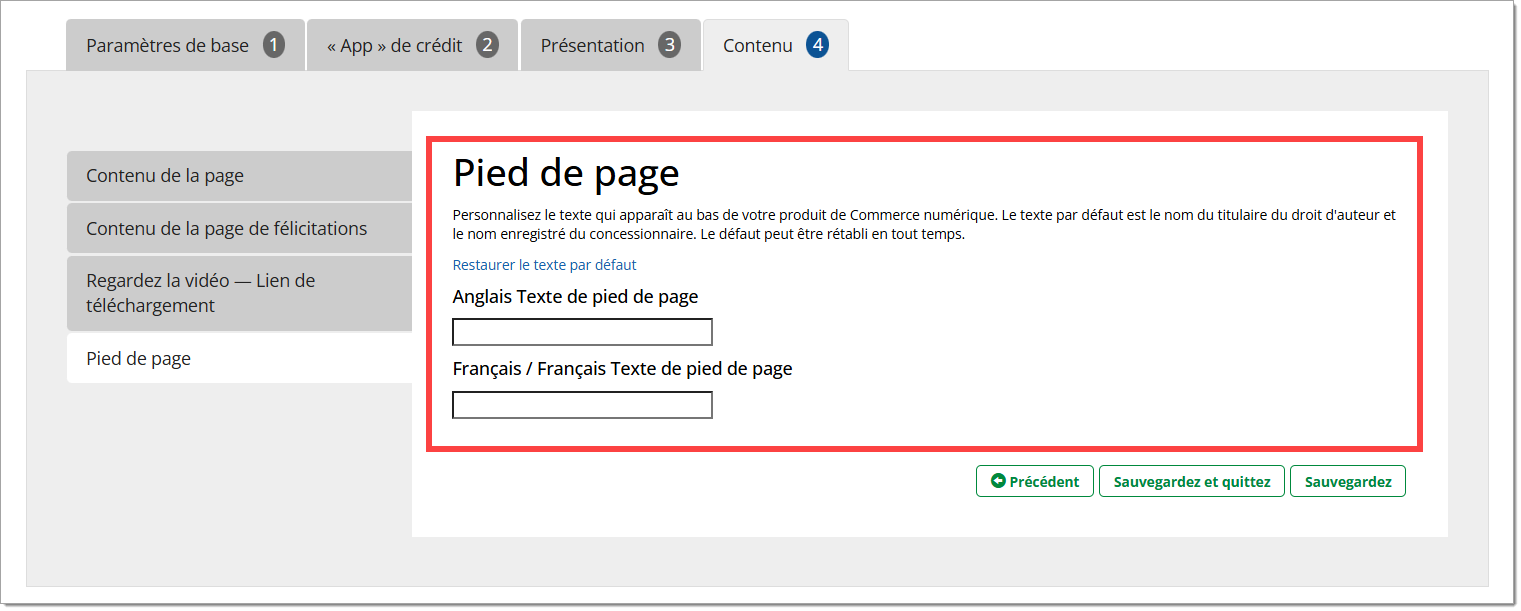 Vous pouvez personnaliser le texte qui apparaît au bas de votre page de produit de commerce numérique en saisissant du texte dans cette section. Des personnalisations peuvent être effectuées ici pour les pages en anglais et en français.