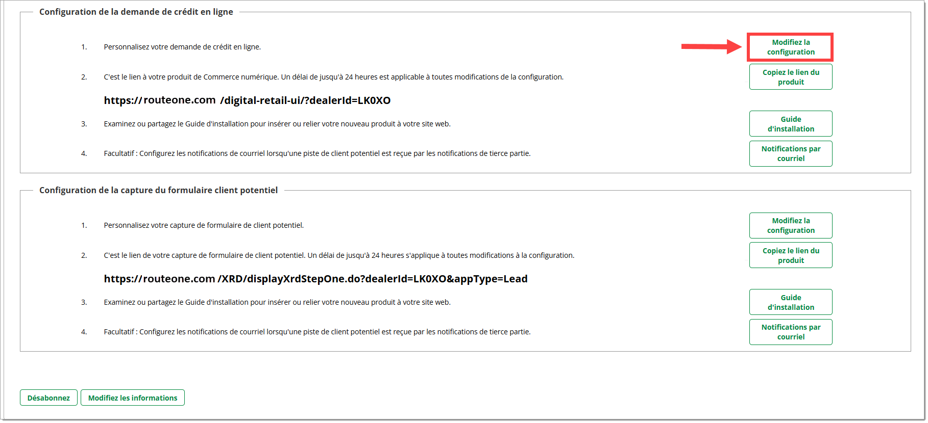 Faites défiler la page jusqu’à la section « Configuration de la demande de crédit en ligne » et cliquez sur le bouton « Modifiez la configuration ».