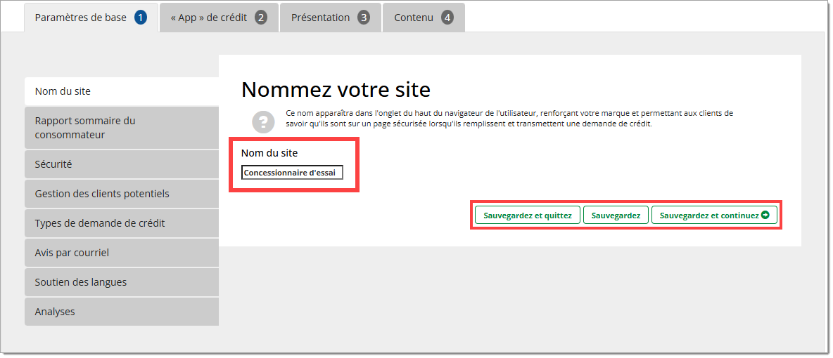 Vous pouvez cliquer les boutons « Sauvegardez et quittez », « Sauvegardez » ou « Sauvegardez et continuez » dans n’importe quelle section au fur et à mesure que vous progressez dans les différentes sections de personnalisation.
