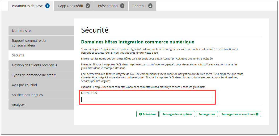 En saisissant tous les noms de domaine hôtes sur lesquels vous intégrerez la demande de crédit direct au consommateur dans un iframe et en enregistrant ce paramètre, vous permettrez à l’iframe de « communiquer » avec votre site Web et empêcherez tout autre cadre de votre site Web d’intercepter les données.